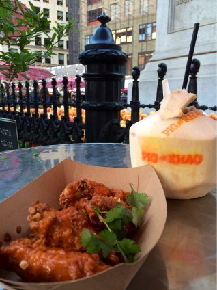 So far this season my favorites are the Lobster Roll from the Red Hook Lobster Pound with huge chunks of pink, steamed claw meat and the Ragu stuffed Arancini from the Arancini Boys, but topping the list (and in my opinion deserving to be its own major food group) are the Southern Style Thai Curry Chicken Wings from the Clinton Street eatery: Pig and Khao. Even before you can sink your teeth into the perfectly blistered skin, the healthy aroma of lemongrass, ginger and chilli could prove challenging to your balance. So just sit down and surrender!
