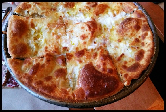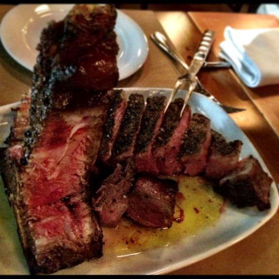 The larger plates grow in portion and price from the delicate bacon wrapped veal Sweetbreads to a honkin’ 50oz Bone-in New York Steak. Traffic-stopping favorites are the Milk-Roasted Pork Loin and the Bistecca Fiorentina (Florentine steak), which requires 45 minutes to roast and arrives with the bone upright, (obviously proclaiming man’s victorious domination over the cow) and a domino row of salt charred (yet rare) medallions of melt-in-your-mouth, succulent, tender, dry-aged beef in a pool of olive oil. No sauce, no spice, no need. (Just the faintly muted sound of a grown man crying!)