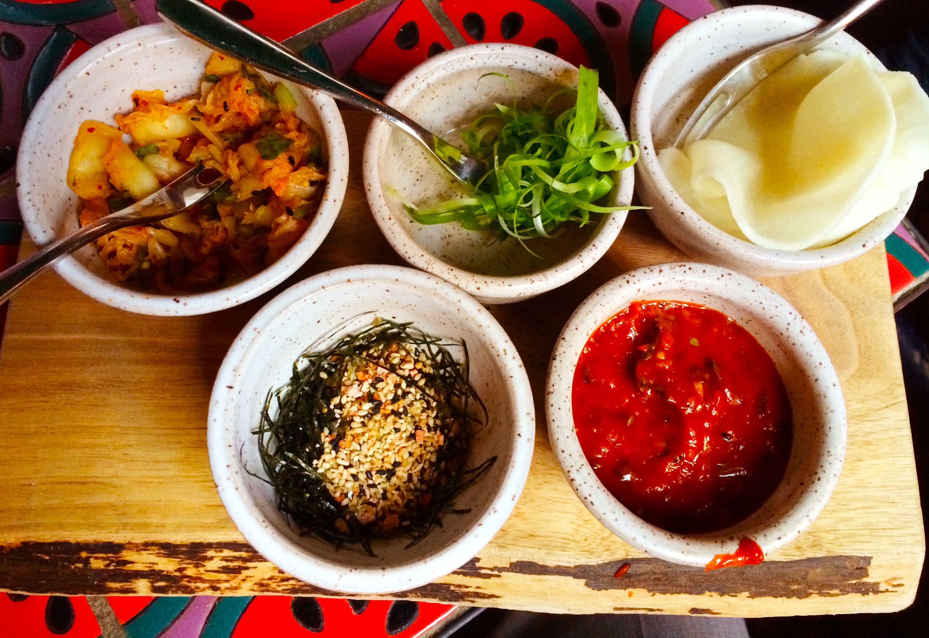 Under the “Taco Dinners” it was a tough toss-up between the Roasted Lamb Shoulder, that the couple next to us were busy tearing apart and shoving into fresh tortillas topped with Cucumber Pico de Gallo and Crema, or the Beer Battered Fish Filet with Tartar and Mayan mayonnaise, (our enthusiastic and bespectacled waitress’s favorite) but we finally settled on the Korean BBQ. This prompted a visit from one of the kitchen staff who proceeded to cut a large and delectably marinated, fire-roasted loin with a large pair of scissors, while firing off a barrage of questions about our heritage, our commute, our love life and other vital curiosities as she explained the tray of flavor accoutrements: crunchy pickled Daikon radish, fresh scallions, house-made Kimchee, Furikake and seaweed spices and a thick (and liberally salted) hot sauce – all the makings of the most inauthentic Taco ever.