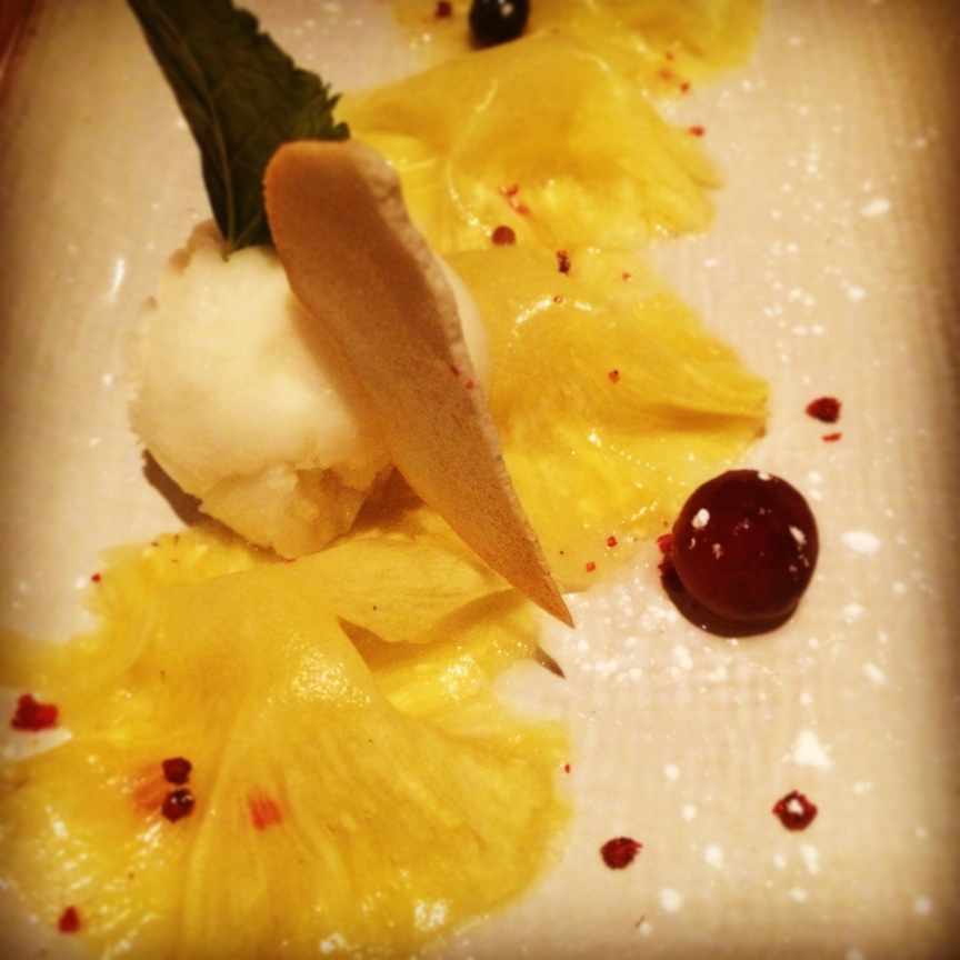 And what better way to walk home than with the crisp and lingering taste of Ananas Carpaccio – X-ray-thin, mint syrup marinated Pineapple slices with lemon sorbet and pink peppercorns.