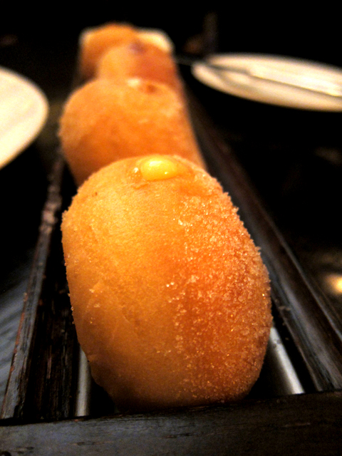 The menu also offers a sizable Not Mussels section, including a wonderfully light and crispy, mixed seafood plate called Burnt Fingers, a very affordable selection of California and European White and Red wines (including a rarely-seen-in-these-parts Turley Old Vines Zinfandel) culminating in the Flex Donut Collection, where 4 or 6 (or more) tennis-ball sized donuts are served with a vanilla dipping sauce on a wooden rack, practically exploding with your choice of sinful fillings, from Salted Caramel and Wild Blueberry to Meyer Lemon…but it’s still all about the mussels!
