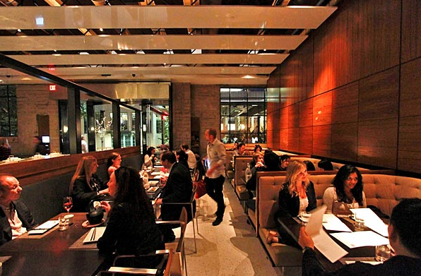 All of the communal counter tops and private tables in the contemporary teak room seem to reach out lovingly towards the lucite lined, multi megawatt kitchen. (I can only imagine how tough it must be for any of the cooks to pick their nose or adjust their groin while working under such a formidable spotlight.)
