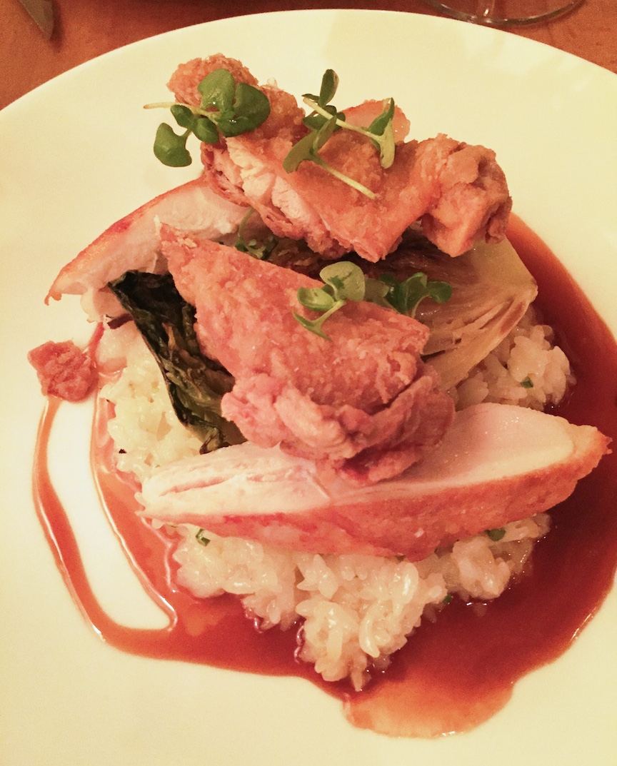 The Chicken is cooked two ways: half of the breast slithers were astonishingly moist and ridiculously velvety – thanks to the gradual cooking of sous-vide, and the rest were fried to a delectably dry crisp. And both were balanced on a satiny porridge pedestal of garlic rice with a few swooshes of basil jus.