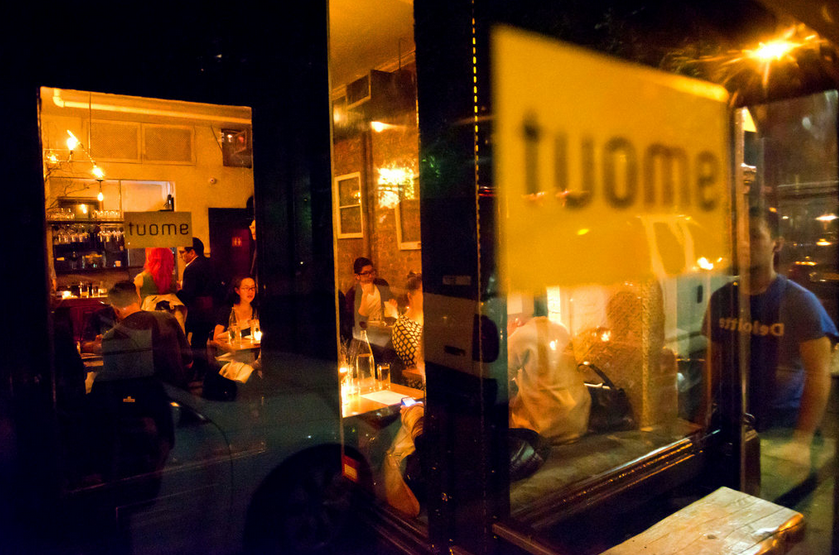 Although many have labeled it South-east Asian, to me, Tuome (pronounced tow-me) is more of an Asian-American micro-bistro with a micro menu serving some exciting twists to familiar dishes in two micro dining rooms tucked away in the nether regions of the East Village. When I noticed that (former-accountant-turned-chef-success-story-in-a-bottle) Thomas Chen offers only 6 appetizers, 5 mains and 4 sides without ever repeating a single ingredient, I knew I needed to settle in and make myself comfortable. The ambiance is romantic enough without any unnecessary fluff. There are a few recycled pieces of rustic bric-a-brac in and amongst the obligatory face-brick, with some interesting incandescent light-bulbs and a single wall of bamboo, but the main features at this 45-seater are the large picture windows…and of course the food.
