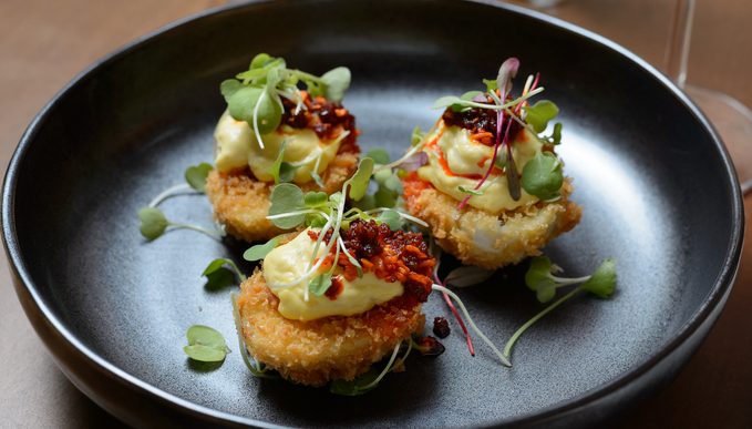 The Egg is not your regular fourth-of-July variety. This one comes with an international pedigree. After being boiled and shelled, the whites are fried in a deliciously crispy panko crust, while the yolks are deviled and topped with the most wonderful mixture of pickles and chilies.