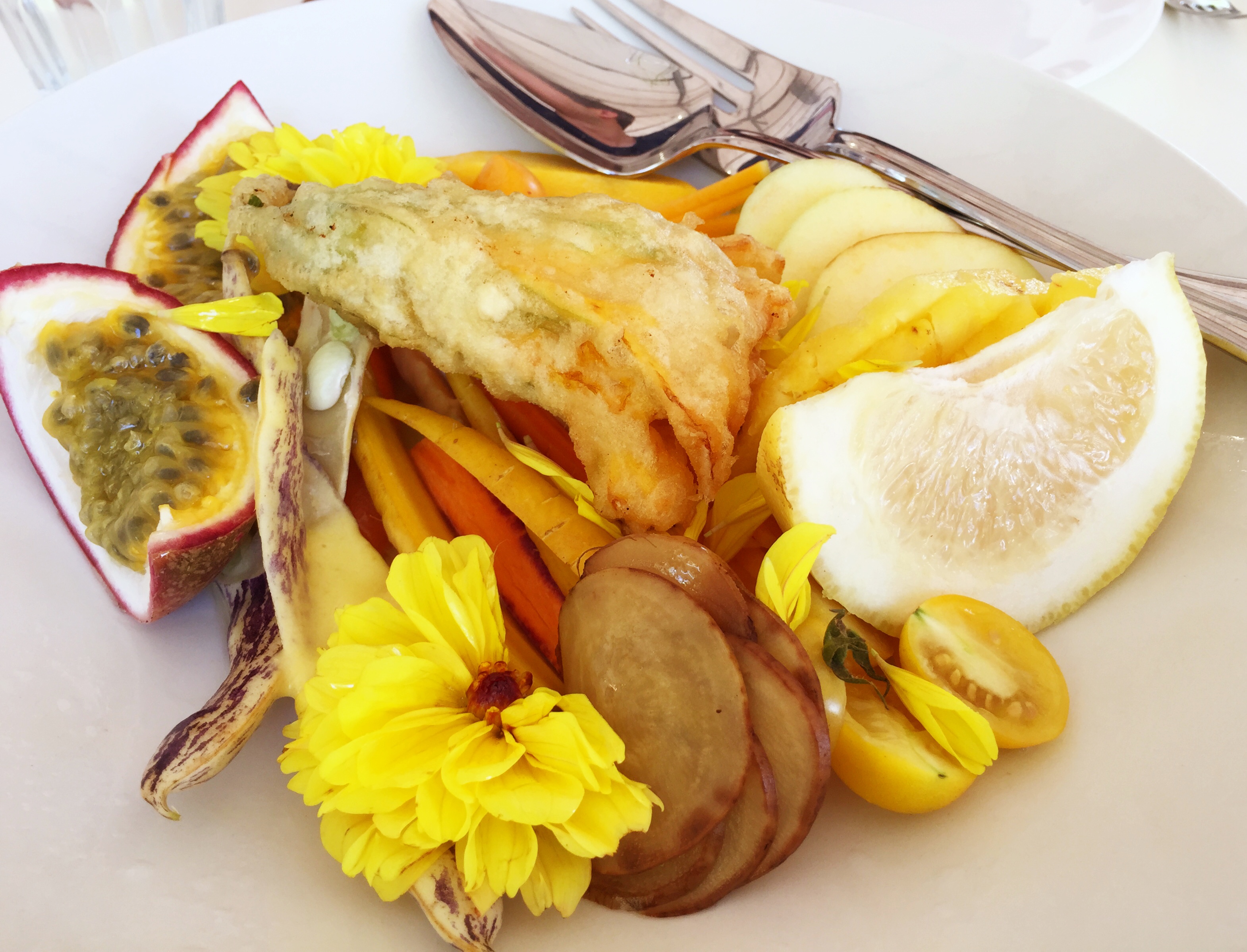 Yellow: Tempura of ricotta stuffed zucchini blossom with butternut, dragon tongue bushbeans, yellow beans, Turkish granadilla, golden delicious apple, yellow pear tomato, tree melon, baby carrots, tiger figs, golden pickled beetroot, sungold plums, pineapple and mango. Dressing – Spicy coconut, coriander and mango.