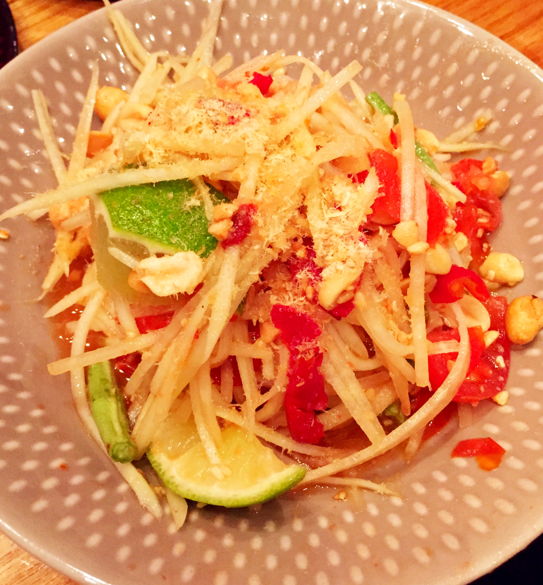 As brave as we had been in trying to keep the chili intensity at bay, nothing could extinguish the 5-alarm fire from the signature Spicy Papaya Salad (of which there are 8 varieties, and up to 4 levels of sinus-clearing heat). Within seconds of munching through the sublime textures of julienned fruit, chopped nuts and lime, we were a silent chorus of gaping mouths like beached sea bass, waving uselessly at our teeth – the universally understood sign for “Great Scott and little fishes! I think my tongue is melting!”