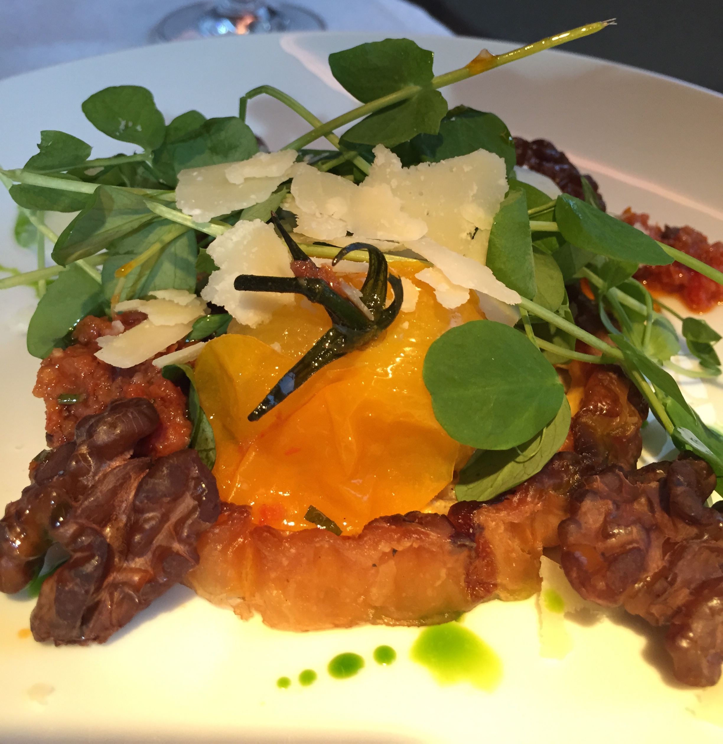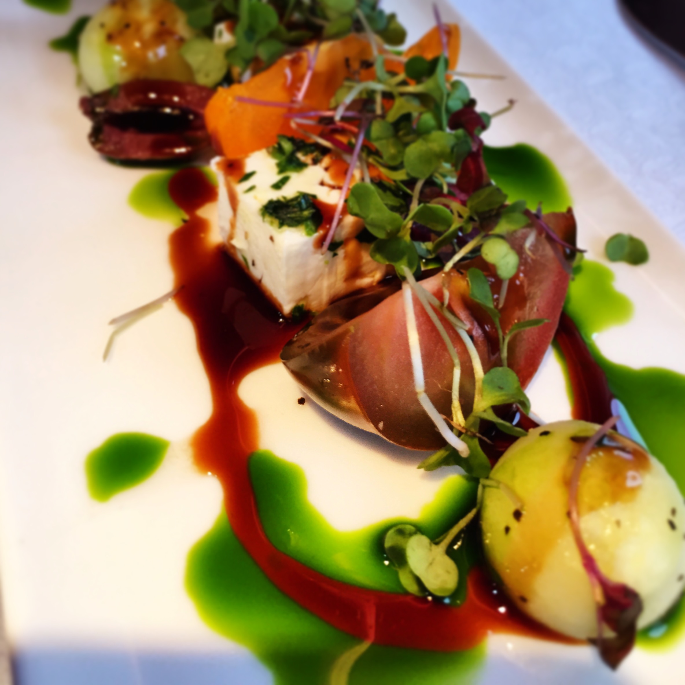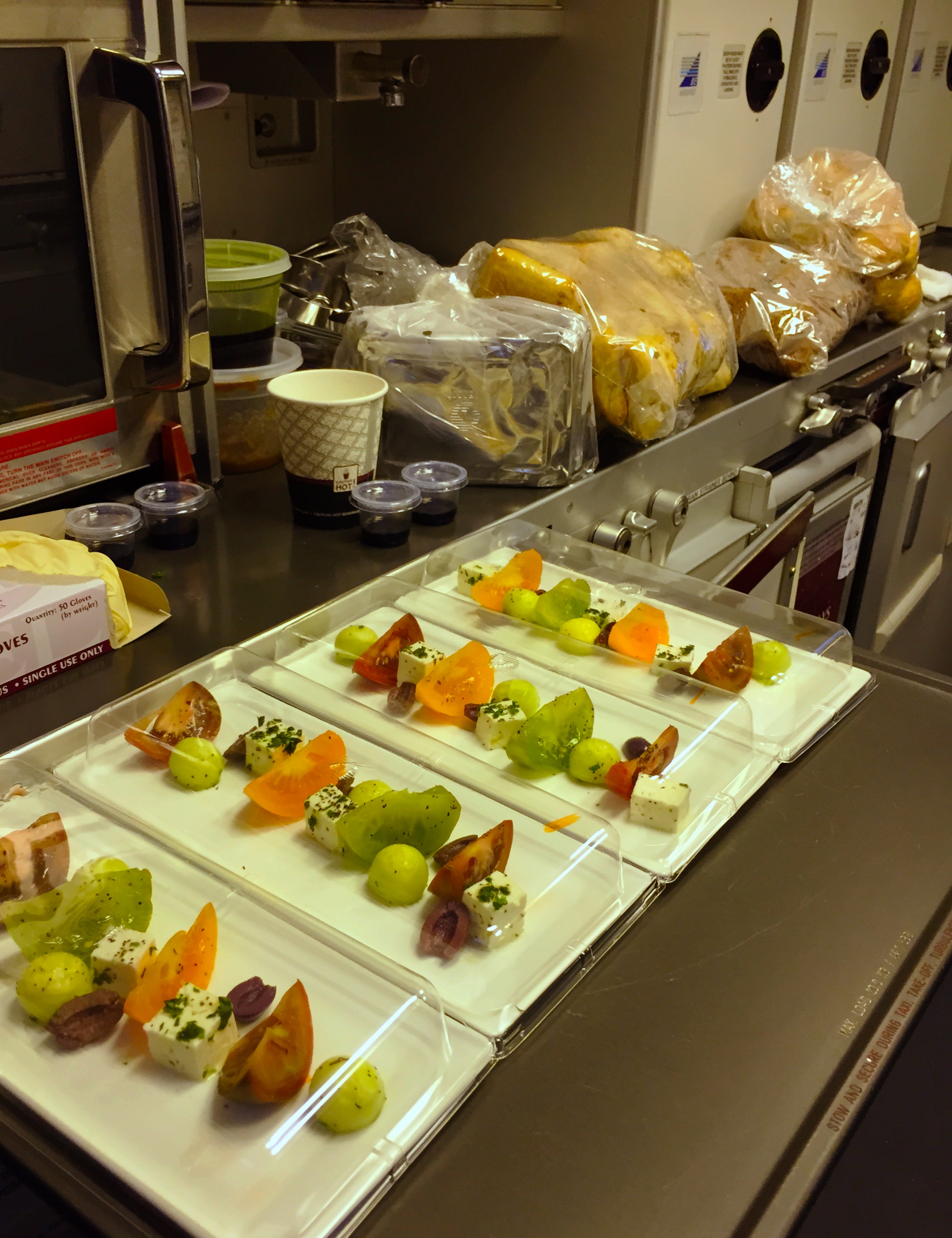 Having seen the pre-plated Heritage tomato, feta and Kalamata olive salad in the galley earlier, I was enormously impressed at how delicately and affectionately the various additions, garnishes and dressings were layered, stacked and tucked into position to yield an incredibly beautiful and flavorful dish.