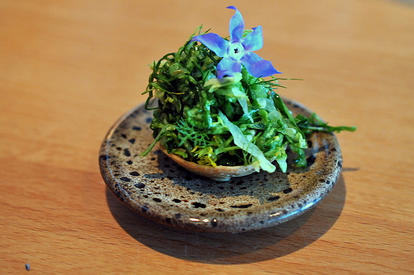 The highly beloved and enormously decorative Artichoke Oysters are every bit as wonderful as their kaleidoscopic shape. Five artichoke leaves over a bed of kosher salt yield a dollop of the vegetable’s creamy puree, that hides a surprisingly crunchy oyster mushroom and sprig of briny kelp.