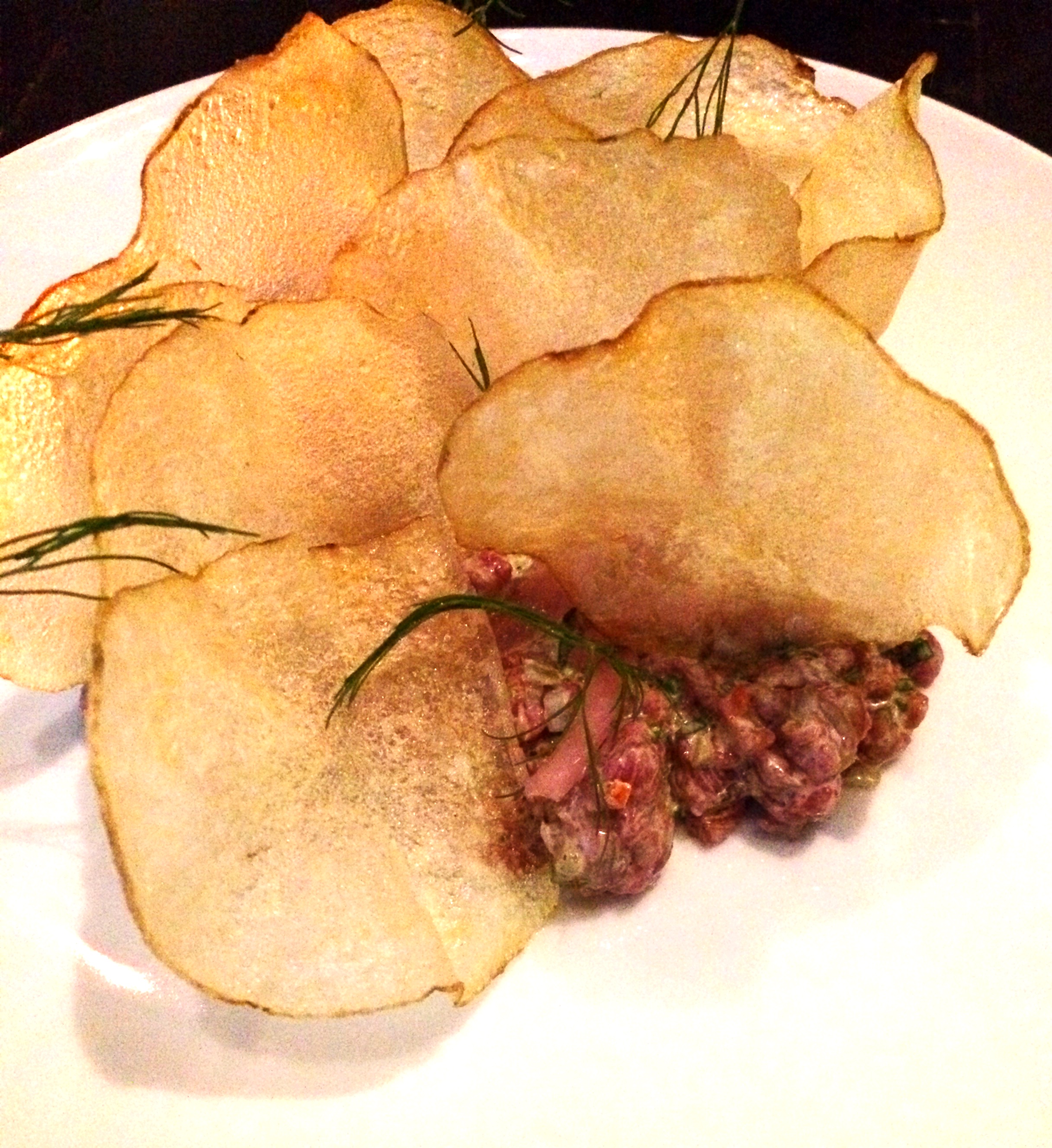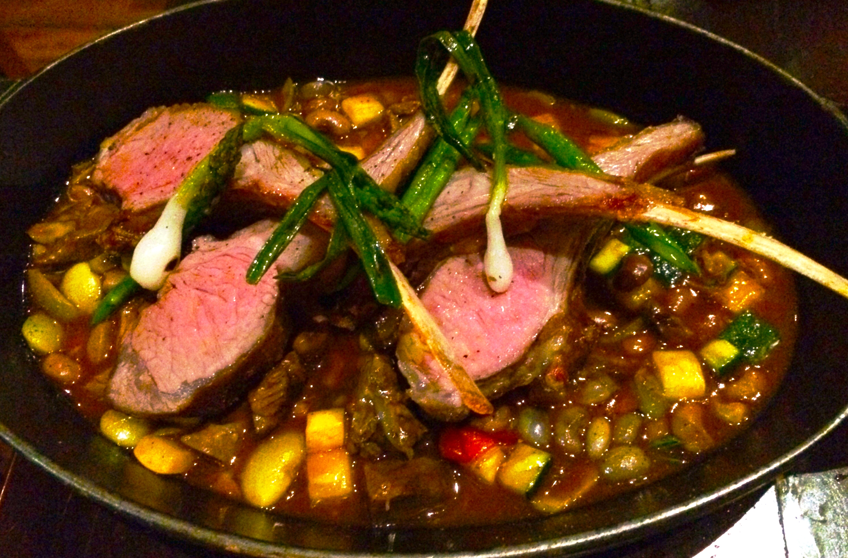 The only oddity in a string of otherwise safe bets were the line of Shrimp and Pork Dumplings straddling an insipid ponzu sauce (rather than, say, a thick soy-garlic dip), but more incongruous were the lonely chicharrones, providing little more than punctuation. But the unsurprisingly popular soft-as-a-salt-water-taffy Meyer Farm Beef Rib-eye arrived nicely charred outside and perfectly pink inside, slithered into pencil strips and topped with a rich disc of melting black truffle butter.