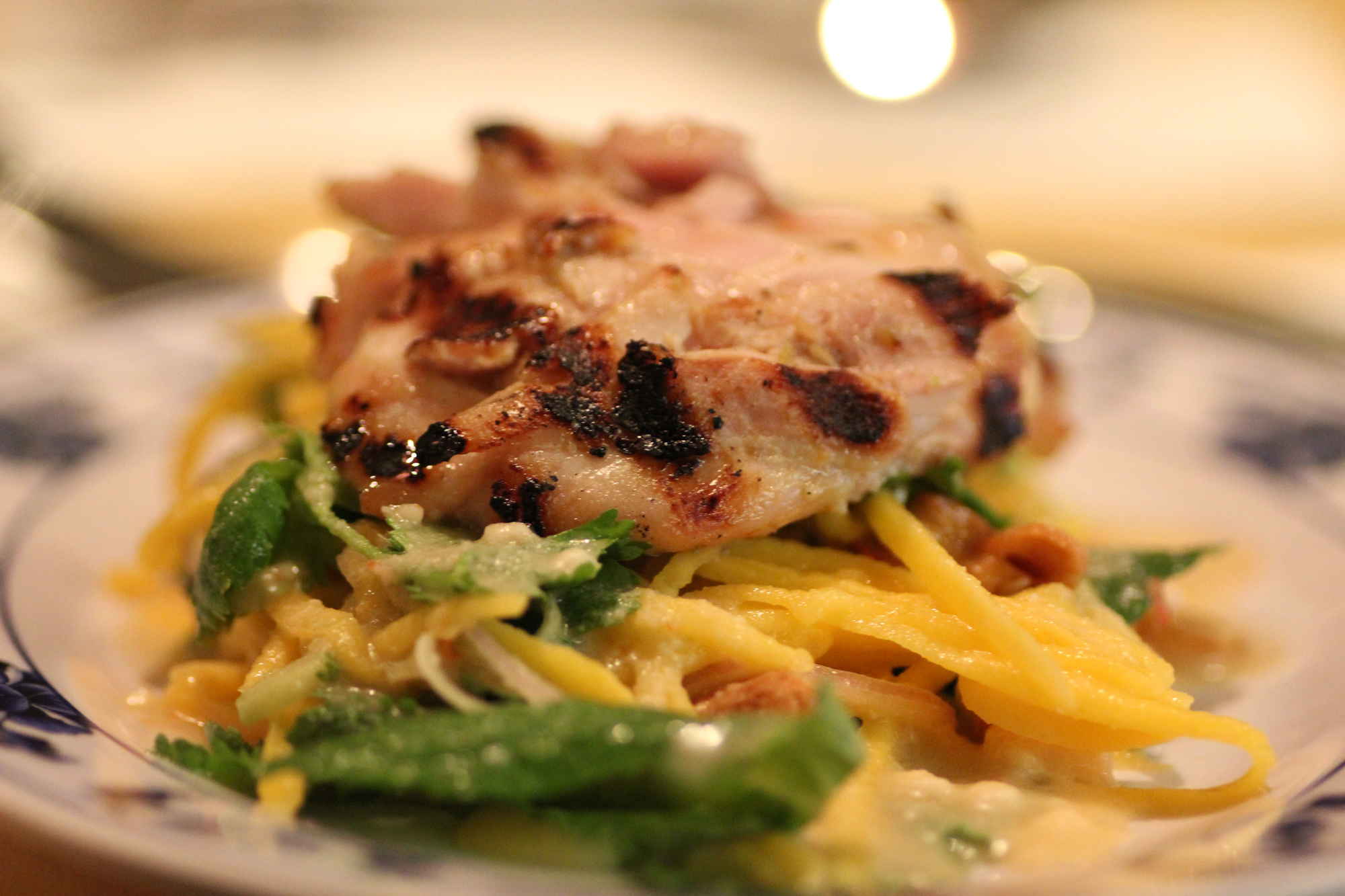 Just because it’s veggie night doesn’t mean we have to slam on the flavor brakes. In fact, this spicy, garlicky Chermoula dressing elevates these grilled eggplants all the way to the penthouse before being topped with a bulgur salad spiked with nuts, olives and a few other surprises.